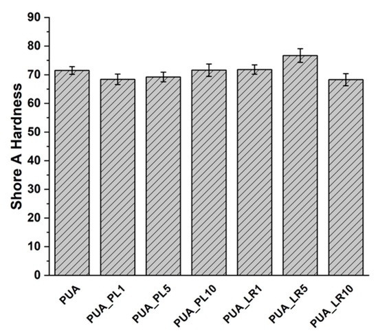 A summary of hardness data is presented in Figure 9. Results clearly show that the hardness of composites is found to slightly increase with increasing filler content for both PUA-palm leaf and PUA-licorice root composites. As already observed for tensile properties, in particular, for tensile stiffness, different fillers resulted in a different global behavior. Licorice root waste provided an increase in composite hardness compared to neat PUA up to 5 wt%, because at higher loading its inhomogeneous dispersion led to a decreased hardness value. On the contrary, palm leaf filler was not able to increase the hardness of the matrix which plateaued around 70.