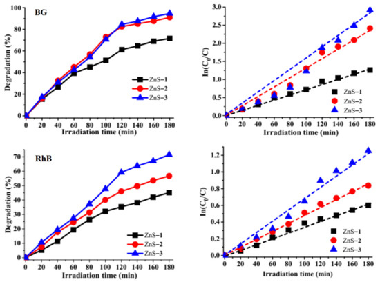Degradation efficiency curves of brilliant green (BG) and rhodamine B (RhB) by ZnS quantum dots and their corresponding kinetics studies plot.