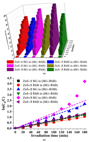 Analysis of the photodegradation of BG, RhB, and the binary dyes by the as-prepared ZnS quantum dots shows that the experiments followed pseudo-first-order kinetics due to the linear relationship between In(C0/C) versus irradiation time, as presented in Figure 5 and Figure 6. Equation (1) was used to determine the rate constant ‘k’ of the kinetics studies [53,54].