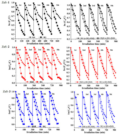 Reusability test of as-prepared ZnS catalysts on brilliant green (BG), rhodamine b (RhB), and binary dyes.