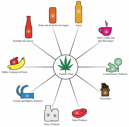 - Rasera, G.B.; Ohara, A.; de Castro, R.J.S. Innovative and emerging applications of cannabis in food and beverage products: From an illicit drug to a potential ingredient for health promotion. Trends Food Sci. Technol. 2021, 115, 31–41. [Google Scholar] [CrossRef]