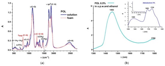 In both fresh and laser irradiated samples, the FTIR spectra reveal molecular structural changes of foam when compared to liquid POL. It is interesting to observe that when POL is foamed, C–H out-of-plane bending vibrations occur, and C–O–H bending vibrations are also influenced (Figure 3a). The optical characterization of POL based on the absorption spectrum registered in UV/Vis/NIR spectral ranges highlights absorption peaks centered in NIR, while it totally transmits in UV/Vis. Previous research has yielded similar results for commercially available Aetoxisclerol (Kreussler Pharma), which contains POL as an active ingredient, owing to the superimposed absorption properties of all the compounds present in the drug solution (Figure 3b) [].