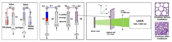 - Dinache, A.; Smarandache, A.; Andrei, I.R.; Urzica, I.; Nichita, C.; Boni, M.; Nastasa, V.; Pascu, M.L. Laser Assisted Generation of Micro/Nanosize Emulsions. Colloids Surf. Physicochem. Eng. Asp. 2019, 577, 265–273. [Google Scholar] [CrossRef]