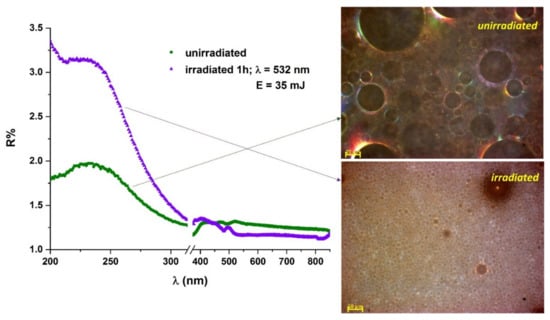 - Dinache, A.; Tozar, T.; Smarandache, A.; Andrei, I.R.; Nistorescu, S.; Nastasa, V.; Staicu, A.; Pascu, M.-L.; Romanitan, M.O. Spectroscopic Characterization of Emulsions Generated with a New Laser-Assisted Device. Molecules 2020, 25, 1729. [Google Scholar] [CrossRef]