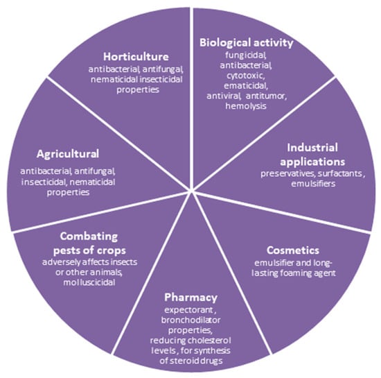 In general, the knowledge about saponins and physicochemical properties of this large group of compounds, while also taking into account their biological activity, can distinguish many possibilities for their practical use. The proposals and various possibilities of saponin use obtained from natural sources, resulting mainly from their physicochemical properties and biological activity, are presented in Figure 2.