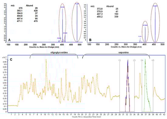 MS spectra of hederagenin (A; negative polarization, m/z 471.1), oleanolic acid (B; negative polarization, m/z 455.2) and example of LC/MS chromatogram of washnut extract (C).