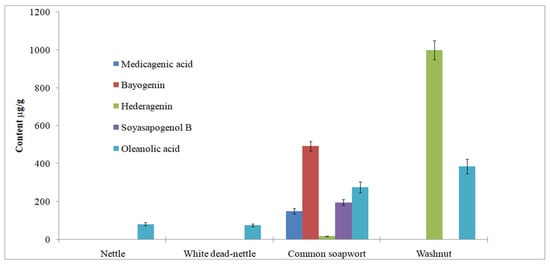 However, the results of quantitative analysis regarding methanol extracts of nettle, white dead-nettle, common soapwort and washnut are presented in Table 4 and graphically in Figure 4. It was ascertained that all sapogenins, medicagenic acid, bayogenin, hederagenin, soyasapogenol B and oleanolic acid, are present in extracts of common soapwort. Extracts from washnut are characterized by the highest concentration of hederagenin (999.1 ± 6.3 μg/g). Methanolic extracts of nettle and white dead-nettle do not contain sapogenins besides oleanolic acid in low concentration, 81.0 ± 0.7 and 76.0 ± 2.7 μg/g, respectively. It was ascertained that sapogenins such as medicagenic acid, bayogenin and soyasapogenol were not present in any extract of washnut.