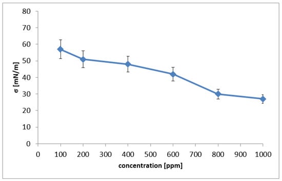 The results obtained for carried out solutions depending on the concentration change are presented in Table 5 and in Figure 4. The first changes in surface tension were observed for concentrations ranging from 400 to 600 ppm. The reduction in the surface tension to ca. 48–42 mN/m with the use of solutions in a concentration range from 800 to 1000 ppm indicates the possibility of wide application of washnut as a detergent. As shown in Figure 5, the surface tension of aqueous solutions dropped from 56.98 mN/m to 26.99 mN/m in 1000 ppm washnut water extract.