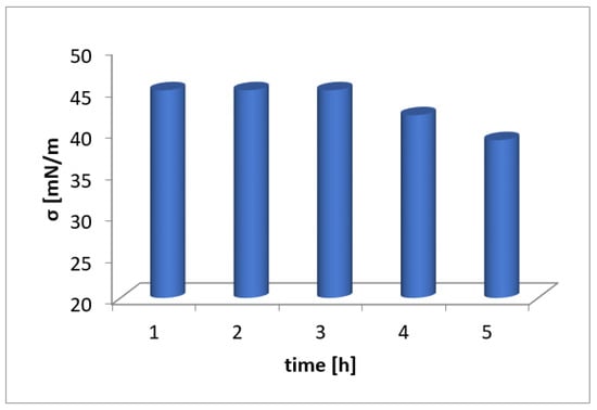 The test results obtained depending on the mixing time are presented in Table 6 and Figure 6. The surface tension in the first 3 h of mixing did not significantly change (constant value of σ = 44.98 mN/m). A noticeable drop occurred only at 4 and 5 h of mixing. It follows that the mixing time of the solution does not significantly change the surface tension.