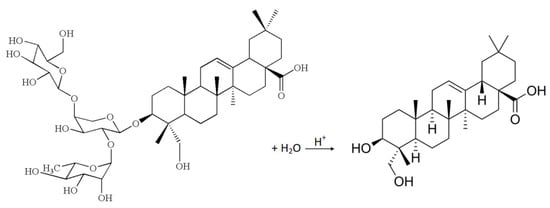 Obtained plant extracts were hydrolyzed (acid hydrolysis) and purified (clean-up procedure) by the use of modified methods that were previously described by Bajkacz et al., 2021 []. Briefly, 300 µL plant extract was mixed with 200 µL distilled water and 100 µL concentrated hydrochloric acid. The mixture was incubated at 85 °C for 2 h. Next, aqueous hydrolyzed extract was purified using SPE with BAKERBOND® Octadecyl. The analytes were eluted with methanol, and the extract was concentrated in a stream of nitrogen. Through the hydrolysis process, unbound sapogenins were formed by removal of the sugar part from the saponins, according with the reaction presented in Figure 7.