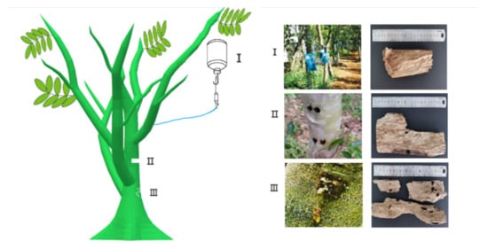 - Liu, Y.; Chen, H.; Yang, Y.; Zhang, Z.; Wei, J.; Meng, H.; Chen, W.; Feng, J.; Gan, B.; Chen, X.J. Whole-tree agarwood-inducing technique: An efficient novel technique for producing high-quality agarwood in cultivated Aquilaria sinensis trees. Molecules 2013, 18, 3086–3106. [Google Scholar] [CrossRef] [PubMed]