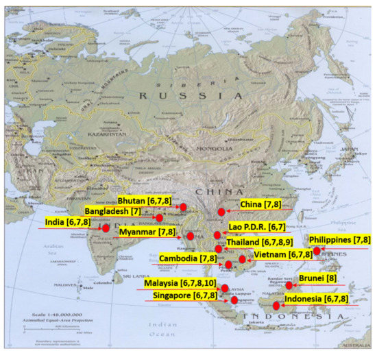 Aquiliria spp. Asiatic distribution map. Red spot showing the distribution in different countries.