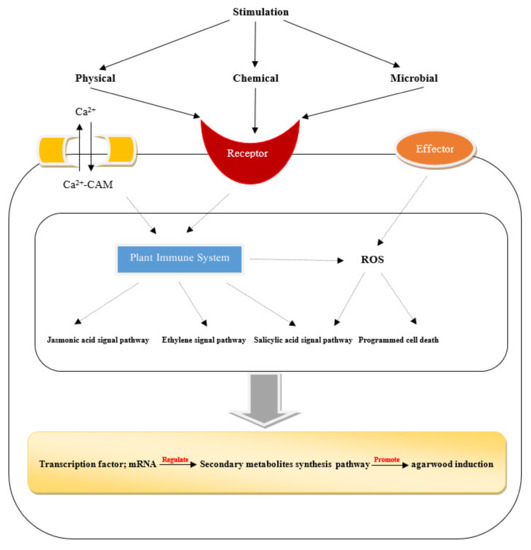 The molecular mechanism of agarwood induction is shown in Figure 3. Artificial incense will replace wild incense to become the main source. The artificial incense-forming technology mainly includes the physical injury method, chemical reagent method, biological planting method, and many more [2]. With the development of incense forming technology, most of the artificial incense is mainly composed of chemical techniques. Zhao and Fang [77] evaluated the quality of agarwood produced by the whole-tree agarwood-inducing technology, and preliminarily considered that the quality of incense produced by this technology conformed to the standard of the Chinese Pharmacopoeia. However, the quality of artificial incense is still different from that of natural incense, it is far from the ratio of high-quality insects in natural incense, and there are few reports on how to use insect microorganisms to cause damage to the incense to form high-quality insect incense. The method of using artificial intervention to make the fragrance quality close to that achieved using natural insects is still a blank, so it is necessary to combine incense with insect microorganisms. To produce the incense using high-quality insect leakage is an area that still requires considerable effort. At present, the studies on artificial incense technology are limited, a problem needs to be solved. Therefore, there is a need to establish a standardized incense base and explore the method of combining animals and plants to improve incense technology and provide high-quality medicinal resources.