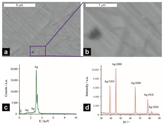 FE-SEM micrographs of the silver electrode (a) and a higher magnification of the selected area (b). The EDS analysis (c) and XRD diffraction pattern (d) of the Ag electrode.