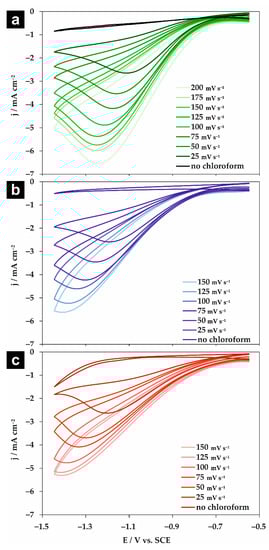 The voltammograms obtained at the Ag electrode in the absence and presence of 8.26 mM chloroform for selected scan rates are shown in Figure 2 for 0.05 M Na2HPO4, NaClO4, and NaH2PO4 solutions. The potentials are referenced to the saturated calomel electrode (SCE). In all studied electrolytes in the potential range of −0.547 to −1.447 V vs. SCE, a competitive reaction (i.e., decomposition of water or supporting electrolyte) was not observed. Only small capacitive currents were observed in the absence of chloroform. Conversely, independently of the studied electrolyte, after the addition of chloroform, one irreversible peak was observed similarly to previous reports (Table 1). Both the potential as well as the current density of the chloroform reduction peak shifted with the scan rate. Such an effect was previously reported for the chloroform reduction in aqueous solutions at Ag [17] and during benzyl chloride reduction in acetonitrile at Ag [29] and AgPd [30] electrodes. It is important to note that the magnitude of the shift strongly depends on the type of studied supporting electrolyte—especially when the results are compared with previously reported data for the chloroform reduction in 0.05 M KClO4 in the same setup [17]. The most significant shift in the reduction potential and highest current density were observed for Na2HPO4. This fact will be discussed later.