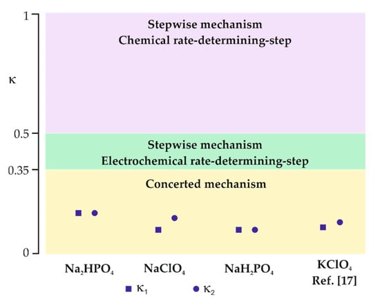 If κ is in the range between 0.35 and 0.5, the process occurs via the stepwise mechanism with an electrochemical rate-determining step. For κ < 0.35, the reaction follows the concerted mechanism and κ values can be considered as a transfer coefficient [17]. Moreover, Equation (1) clearly shows that the observed shift in the reduction potential with scan rate is correlated with the electron transfer coefficient. As can be seen in Figure 4, the peak current density (jp) is linearly dependent on the square root of the scan rate (ν0.5) for all used supporting electrolytes, which indicates that the reaction is diffusion-controlled [31]. Since Ep vs. log ν dependencies (insets in Figure 4) are linear with negative slopes, it was possible to estimate κ values (Table 2) from Equations (1) and (2).