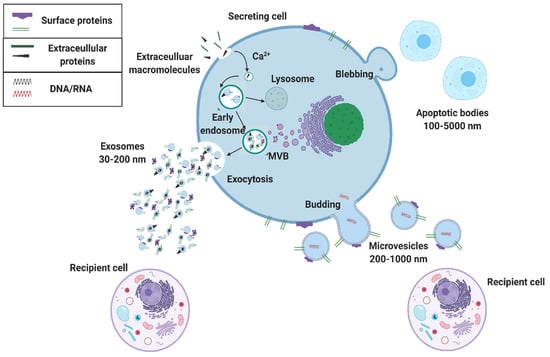 Extracellular vesicles are categorized by their size and mode of secretion (Figure 2) [,]. The smallest of these exosomes have a diameter range of 30–150 nm and are formed through calcium-mediated endocytosis pathways. Exosome formation begins with an early endosome, which advances to a multivesicular body (MVB). The MVB holds one of two fates: (1) directed toward a lysosome for digestion or (2) for exocytosis out of the cell (Figure 2) [,,,]. This pathway is one of the ways that exosomes set themselves apart from their larger counterparts since exosome endosomal formation can intersect with vesicle formation from cell organelles. Through this pathway, exosomes can carry information about cell organelles and plasma membrane biomarkers. Emerging evidence shows that exosomes are deliberately packaged and carry valuable information from their parent cell. Exosome cargo is in the form of DNA, RNA, metabolic enzymes (peroxidases, lipid kinases), tetraspanins (CD9, CD63, CD81), heat shock proteins (HSP70, HSP90), and cytosolic proteins (tubulin, actin)—all specific to parent cell function (Figure 1) [,,,,]. Various exosome surface biomarkers and cargo provide information about their originating parent cells as well as intended target cells; thus, exosomes provide information about their intended function, making them excellent biomarkers for precision-medicine and liquid biopsies.