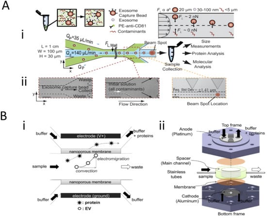 To expand on field-based isolation techniques, Dudani et al. 2015 (Figure 3A) and Cho et al. 2016 (Figure 3B) integrated other standard methods of isolation with an externally applied field to facilitate exosome isolation. Dudani discusses the use of a microfluidic device that incorporates rapid inertial solution exchange (RInSE) for exosome isolation []. Biotinylated anti-human CD63 antibodies (specific exosome marker) were conjugated to the streptavidin-coated polystyrene exosome capture beads and injected into the device with tris buffer solution (TBS) as the exchange solution (Figure 3Ai). The sample fluid is presented with a co-flow of TBS sheath fluid at different flow rates (Figure 3Aii). Due to inertial lift forces, the exosome bound beads were streamlined into the exchange buffer, and contaminants were siphoned off []. A flow cytometer and an inline fluorescence detection system were integrated into the device, which allowed for integrated downstream analysis of the size and other molecular and protein analysis. On the other hand, Cho coupled electrophoretic migration with size-exclusion filtration. The Cho device actuates nanoparticle separation based on zeta-potential, which is proportional to particle size []. Exosomes and most proteins have a negative surface charge and zeta potential. The device utilizes a two-electrode and two-nanoporous (30 nm) membrane system in a sandwiched configuration, which allows the horizontal flow of sample and buffers with a fixed flow rate and vertical migration of particles towards the nanoporous membrane from the applied voltage (Figure 3Bi). Figure 3Bii shows an implementation diagram of the device where negatively charged particles (exosomes and proteins) migrate towards the anode, ensuring interaction with the nanoporous membrane. Proteins are small enough to flow through the filter pores, and exosomes are trapped on the surface of the membrane. All neutral and positively charged particles (impurities) gravitate towards the cathode and filter out.