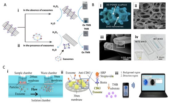 Using a slightly different approach, Chen et al. 2018 developed the ZnO-chip biosensor to detect exosomes by incorporating a size-exclusion-like effect on the standard immunocapture and colorimetric assay. The microfluidic device consists of two parts: ZnO nanowires fit exosome diameter range and a microporous chip embedded with a three-dimensional (3D) polydimethylsiloxane (PDMS) scaffold (Figure 4Bi, ii). Then ZnO nanocrystals were seeded into the scaffold (Figure 4Bi) []. The ZnO nanowires were additionally decorated with anti-CD63, and this unique ZnO wire antibody immobilization presented a larger surface area for capturing exosomes (Figure 4Biii). Exosomes were introduced to the ZnO chip via blood serum at an optimum flow rate of 10 uL/min with exosome detection visualized with a similar TMB colorimetric reaction (Figure 4Biv).