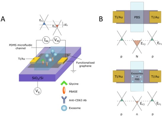 Antibody surface functionalization for exosome capture and electric biosensing with graphene. (A) Schematic of gFET mechanism for detection of negatively charged exosomes once captured by the graphene surface through surface functionalization with a chemical linker and anti-CD63 antibody. (B) Schematic of negative charge from exosome surface potential leading to positive charge accumulation in the graphene surface, showing Fermi energy of graphene surface. Reprinted with permission from Copyright Clearance (2019) Springer Nature Scientific Reports.