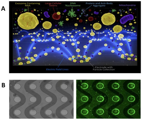 Schematic of exosomes and other particles separated with the alternating current electrokinetic (ACE) microarray chip. (A) ACE microarray chip fluorescent schematic of dielectrophoretic separation force pulling exosomes to microelectrodes. (B) Bright-field image of the circular microelectrodes (left) and fluorescent image of CD63 at the electrode edges (right) (reprinted with permission from Ibsen et al. American Chemical Society 2017).