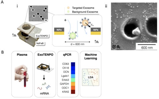 Integration of multiple screening techniques allows researchers and clinicians to receive the most information available from each biofluid. Ibsen et al. 2017 integrated multiple techniques for glioblastoma exosome profiling. Additionally, Ko et al. 2017 developed a device termed, ExoTENPO to isolate specific subtypes of exosomes from plasma by magnetically labeling them and employing machine learning to determine cancer and pre-cancer individuals and mice from healthy cohorts based on exosomal mRNA cargo []. To do this, ExoTENPO is designed to have pores that are 600 nm in diameter to allow aggregates and cell debris to pass through. A second polycarbonate membrane with a 200 nm pore is coated with a layer of Ni80 Fe20 (magnetic material) at the edge of each pore to magnetically isolate exosomes (Figure 7Ai). Each magnetically captured exosome is labeled in two-steps with biotinylated antibodies (CD9 and CD63 for exosomes and EPCAM for cancerous subpopulations) and streptavidin-coated 50 nm magnetic nanoparticles (Figure 7Aii) []. This two-step process allows for 10× less antibody usage and more particle loading. Only particles bound to the magnetic nanoparticles will go toward the NiFe magnet creating a high flow, minimizing background noise from other particles. Furthermore, these magnetic approaches are favorable over optical approaches when working at nanoscales because magnetostatics is not confined to any geometry, whereas the size of optical trapping is limited by the wavelength of light. Finally, a neodymium (NdFEB) disc magnetizes both the ExoTENPO and the magnetic particles for on-chip lysing (Figure 7B). Exosomal mRNA is then isolated and profiled using qPCR, and a machine-learning algorithm is applied to predict the state of the patient.