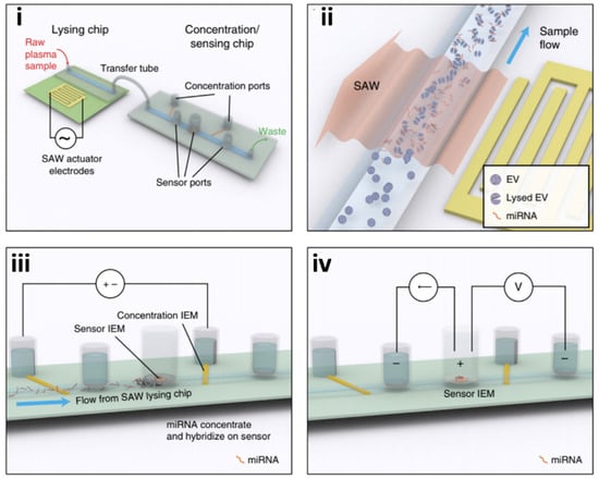 Ramshani et al. 2019 took a similar approach to Ko in combining mechanical exosome lysing and membrane sensor technologies into an amplification-free, single-step quantification of exosome micro RNAs (miRNAs) from untreated plasma samples. Extracellular vesicles (EV) containing microRNAs (miRNAs) have tremendous potential as biomarkers for the early detection of disease. The microfluidics platform is capable of absolute quantification (<10% uncertainty) of both free-floating miRNAs and exosomal-miRNAs in plasma with 1 pM detection sensitivity []. The assay time is only 30 minutes as opposed to 13 hours with conventional techniques (Supplementary Table S1) [] and requires only ~20 μL of the sample as opposed to 1 mL for conventional RT–qPCR techniques. Unlike conventional RT–qPCR methods, this technology does not require a separate step for exosome extraction, RNA purification, reverse transcription, or amplification. This platform can be easily extended for other RNA and DNA targets of interest, thus providing a viable screening tool for early disease diagnosis, prognosis, and monitoring of therapeutic response. As shown in Figure 8, the device consists of a connected two-chip system. The first chip is made of a polycarbonate microfluidic channel, which the raw plasma sample passes through, laid atop a piezoelectric substrate (Figure 8i). To the side of the microchannel, a surface acoustic wave (SAW) electrode projects along the piezoelectric surface []. The SAWs provide the mechanical lysing of passing exosomes (Figure 8ii) [,]. A connecting tube transfers the lysed sample into a second chip where the concentration and sensing of the miRNAs occur (Figure 8iii,iv). The second chip utilizes two sets of ion exchange membranes (IEMs) to concentrate and quantify the target miRNAs []. For IEM sensing, the surface is functionalized with oligo probes that are complementary to the target miRNAs. After hybridization, the resulting voltage shift can be directly correlated with miRNA concentration.