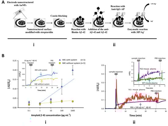Costa-Rama et al. 2014 developed an electrochemical immunosensor for the detection of amyloid beta1-42 (Aβ1-42) purified protein. Amyloid-beta (Aβ) is a protein in which its accumulation within the brain presents neuropathological effects. The immunosensor consisted of screen-printed carbon electrodes with streptavidin-modified gold nanoparticles for transducing the electrochemical binding of Aβ1-42 (Figure 9Ai). The binding of Aβ1-42 to the sensing surface is facilitated with biotin-Aβ1-42 and anti-Aβ1-42 causing an analytical signal to be produced from anodic stripping of the silver electrodes by cyclic voltammetry (Figure 9Aii). The developed sensor was performed with an LOD of 0.1 ng/mL and a wide linear range between 0.5 and 500 ng/mL. This lower limit of the linear range is acceptable, given the current standard of Aβ to diagnose patients with dementia, and AD has a cutoff value around 500 pg/mL []. Tao et al. 2015 adopt a miniature quartz crystal microbalance (MQCM) for the detection of the same Aβ1-42 biomarker. This technique is favorable because it presents a label-free strategy for detecting aging biomarkers. The principles behind MQCM are that once the mass of a sample is loading on the piezoelectric active crystal area, there is a shift in the resonance frequency, which is directly detected by a gold-plated sensor []. Specific detection of Aβ42 was achieved with a cross-linker and Aβ42 antibody immobilization on the piezoelectric detecting reservoir. On-chip determination of Aβ42 from human serum was realized by correlating resonance frequency over time with the concentration of Aβ42, resulting in a linear range from 0.1 µM to 3.2 µM.