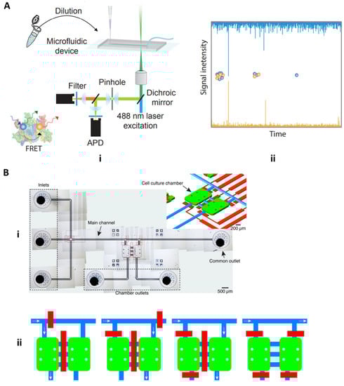 The neurodegenerative biomarkers discussed thus far have focused solely on Alzheimer’s disease. However, other neurological diseases such as Parkinson’s disease and dementia with Lewy bodies (DLB) are strongly correlated with another neurotoxic biomarker, namely alpha-synuclein (aSyn). It has been suggested that, like other neurotoxic biomarkers, aSyn can form aggregated oligomers that may result in various synucleinopathies []. Horrocks et al. 2015 aimed to detect kinetic changes between amorphous oligomers, which have low cell cytotoxicity and structural rearrangement to form the proteinase-K resistant and heavily cytotoxic oligomers using single-molecule Forster resonance energy transfer (FRET). Using a microfluidic chip under “fast-flow,” essentially with a velocity of 2 cm/s, a diluted sample of fluorescently labeled aSyn oligomers and monomers were injected into the sample inlet, with the outlet connected to a pump for inducing a negative pressure and the fast-flow. The device itself is mounted onto a confocal microscope in which 488 nm radiation is focused down, and fluorescence from 488 nm and 594 nm (excited indirectly from the dichroic mirror) is detected by avalanche photodiode detectors (APDs) (Figure 10Ai). Cytotoxic oligomers have a more complex, aggregated conformation and a larger FRET signal compared to less cytotoxic oligomers and monomers (Figure 10Aii) [].