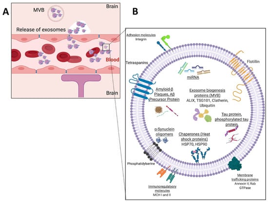 Recently, there has been an exponential increase in the number of reports regarding exosomes and their role in various pathologies such as cancers and age-associated diseases such as neurological diseases [,]. In addition, the ability of exosomes to cross the blood–brain barrier (BBB) has made them a potential source of attractive biomarkers. Biomarkers that they carry as their cargo are useful to validate or identify mechanisms associated with neurological diseases [,].