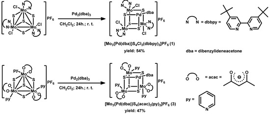 - Sokolov, M.N.; Chubarova, E.V.; Virovets, A.V.; Llusar, R.; Fedin, V.P. Reactivity of Mo3PdS44+ cluster: Evidence for new ligands PhP(OH)2 and Ph2P(OH) and structural characterization of [Mo3(Pd(PPh3))S4(H2O)5Cl4]·0.5CH3OH·3H2O. J. Clust. Sci. 2003, 14, 227–235. [Google Scholar] [CrossRef]