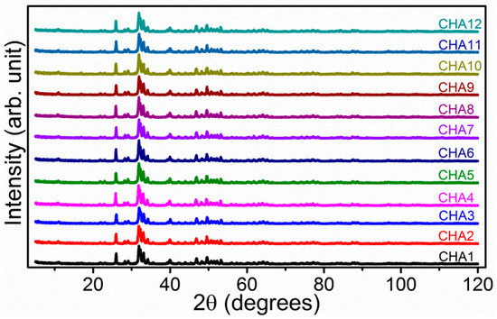Powder X-ray diffraction (PXRD) data of hydrothermally synthesized carbonated hydroxyapatite (CHA) samples with varied amounts of K2CO3 for the starting reactant in the same synthetic procedure: CHA1 1.0 mmol (0.1382 g), CHA2 2.0 mmol (0.2764 g), CHA3 3.0 mmol (0.4146 g), CHA4 4.0 mmol (0.5528 g), CHA5 5.0 mmol (0.6910 g), CHA6 6.0 mmol (0.8292 g), CHA7 7.0 mmol (0.9674 g), CHA8 8.0 mmol (1.1056 g), CHA9 9.0 mmol (1.2438 g), CHA10 10.0 mmol (1.3820 g), CHA11 11.0 mmol (1.5202 g), and CHA12 12.0 mmol (1.6584 g), respectively.