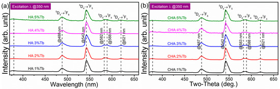 Emission spectra of Tb3+ in (a) hydroxyapatite (HA), and (b) carbonated-hydroxyapatite (CHA) nanocrystals with various doping levels from 1% to 5%.