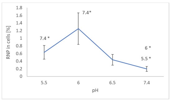Effect of pH on the uptake of NRNPs pH by SH-SY5Y cells. * p < 0.05 with respect to the pH indicated, Student t-test; n = 3.