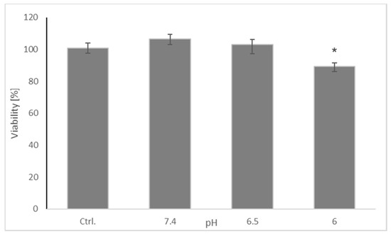 Effect of pH on the viability of SH-SY5Y cells. Cell viability was estimated with Presto Blue. The whiskers are lower (25%) and upper (75%) quartile ranges. * p ≤ 0.05, Kruskal–Wallis test vs. control (Ctrl); n = 9.