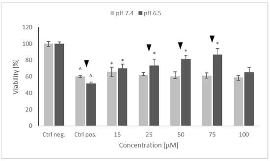 The protective properties of NRNPs pH against 65 μM 6-hydroxydopamine-induced cytotoxicity for SH-SY5Y cells at pH 7.4 and pH 6.5. Cell viability was estimated with MTT. The whiskers are lower (25%) and upper (75%) quartile ranges. ^ p ≤ 0.05, Kruskal–Wallis test vs. the negative control (Ctrl neg.; cells not treated with 6-OHDA), ▼ p ≤ 0.05, Mann–Whitney U test; differences between the different pH conditions (pH 7.4 vs. pH 6.5), * p ≤ 0.05, Kruskal–Wallis test vs. positive control (Ctrl pos.; cells treated with 6-OHDA only, without any pretreatment); n = 9.