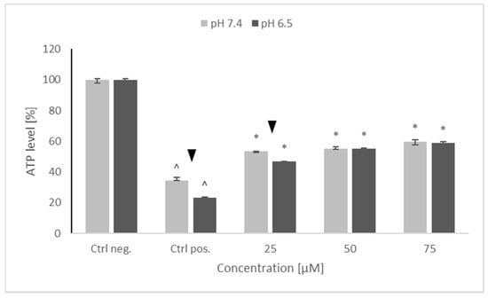 Treatment with 6-OHDA induced a significant drop in the ATP level of the SH-SY5Y cells, more pronounced at pH 6.5 than at pH 7.4. Preincubation with NRNPs pH partly prevented this drop and, starting from the concentration of 50 μM, the ATP level was preserved at the same level at both pH values. However, maximal ATP level in the cells pretreated with NRNPs pH and challenged with 6-OHDA did not exceed 60% of the level of the negative control (cells not treated with 6-OHDA) (Figure 4).