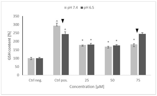 Glutathione (GSH) content of SH-SY5Y cells after pretreatment with NRNPs pH and exposure to 6-hydroxydopamine. The whiskers are lower (25%) and upper (75%) quartile ranges. ^ p ≤ 0.05, Kruskal–Wallis test vs. the negative control (Ctrl neg.; cells not treated with 6-OHDA), ▼ p ≤ 0.05, Mann–Whitney U test; differences between the different pH conditions (pH 7.4 vs. pH 6.5), * p ≤ 0.05, Kruskal–Wallis test vs. positive control (Ctrl pos.; cells treated with 6-OHDA only, without any pretreatment); n = 9.