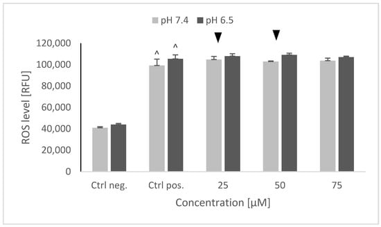 ROS level in SH-SY5Y cells determined using dihydroethidine (DHE) after pretreatment with NRNPs pH and exposure to 6-hydroxydopamine. The whiskers are standard deviation. ^ p ≤ 0.05, Student t-test vs. the negative control (Ctrl neg.; cells not treated with 6-OHDA), ▼ p ≤ 0.05, paired Student t-test, differences between the different pH conditions (pH 7.4 vs. pH 6.5), (Ctrl pos.; cells treated with 6-OHDA only, without any pretreatment); n = 3.