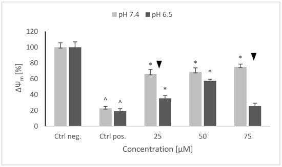 Changes in the mitochondrial potential of SH-SY5Y cells after pretreatment with NRNPs pH and exposure to 6-hydroxydopamine. The whiskers are standard deviation. ^ p ≤ 0.05, Student t-test vs. the negative control (Ctrl neg.; cells not treated with 6-OHDA), ▼ p ≤ 0.05, paired sample Student t-test, differences between the different pH conditions (pH 7.4 vs. pH 6.5), * p ≤ 0.05, Student t-test vs. the positive control (Ctrl pos.; cells treated with 6-OHDA only, without any pretreatment); n = 3.