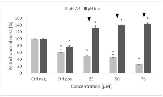 Changes in the mitochondrial mass after pretreatment of SH-SY5Y cells with NRNPs pH and exposure to 6-hydroxydopamine. The whiskers are standard deviation. ^ p ≤ 0.05, Student t-test vs. the negative control (Ctrl neg.; cells not treated with 6-OHDA), ▼ p ≤ 0.05, paired Student t-test, differences between (pH 7.4 vs. pH 6.5), * p ≤ 0.05, Student t-test with respect to the positive control (Ctrl pos.; cells treated with 6-OHDA only, without any pretreatment); n = 3.
