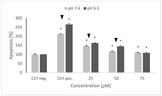 The level of apoptosis of SH-SY5Y cells after pretreatment with NRNPs pH and exposure to 6-hydroxydopamine. The whiskers are standard deviation. ^ p ≤ 0.05, Student t-test vs. the negative control (Ctrl neg.; cells not treated with 6-OHDA), ▼ p ≤ 0.05, paired Student t-test, differences between different pH conditions (pH 7.4 vs. pH 6.5), * p ≤ 0.05, Student t-test vs. the positive control (Ctrl pos.; cells treated with 6-OHDA only, without any pretreatment); n = 3.
