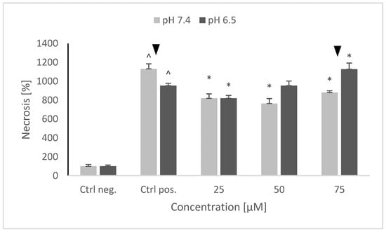NRNPs pH also decreased the rate of necrosis at pH 7.4, but this effect was not concentration-dependent. At pH 6.5, NRNPs pH were the most effective at the lowest concentration applied (25 μM); the protective effect was lower at higher concentrations (Figure 10).
