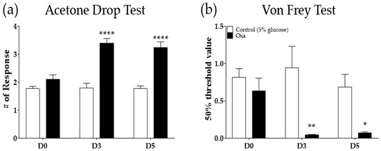 Following a single intraperitoneal injection of oxaliplatin (6 mg/kg), significant cold and mechanical allodynia were induced on day three (D3) and day five (D5) (Figure 1a,b). These results are in accordance with our previous study showing that a single oxaliplatin treatment induced cold and mechanical allodynia 3 to 7 days after injection [8]. On D3 and D5, cold allodynia was strongly induced in oxaliplatin-injected mice compared to mice treated with 5% glucose (control, p < 0.0001), as shown in Figure 1a. In the von Frey test, the 50% threshold value also significantly lowered both on D3 (p < 0.01) and on D5 (p < 0.05) after oxaliplatin injection compared to control (Figure 1b). Cold allodynia was measured by using the acetone drop test, and mechanical allodynia was assessed by using the von Frey filament test.