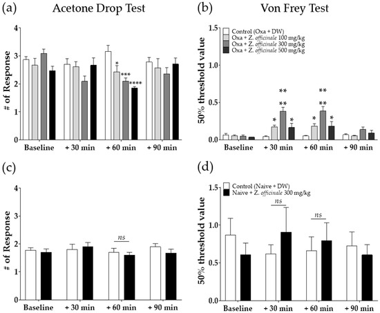 Time-dependent effect of Zingiber officinale on cold and mechanical allodynia induced by oxaliplatin (a,b). Time-dependent effect of Z. officinale in naïve mice (c,d). The effect of the oral administration of Z. officinale on cold (a) and mechanical (b) allodynia induced by a single oxaliplatin (6 mg/kg, i.p.) injection. Cold and mechanical allodynia were assessed by using the acetone drop and von Frey filament tests, respectively. Effect of Z. officnale administration (p.o.) on cold (c) and mechanical (d) stimuli in naïve mice. For cold and mechanical stimuli, acetone drop and von Frey filament tests were used, respectively. Distilled water (DW) was used as control. Control (Oxa + DW): n = 10, Oxa + Z. officinale 100 mg/kg: n = 7, Oxa + Z. officinale 300 mg/kg: n = 7, Oxa + Z. officinale 500 mg/kg: n = 7 (a,b). Control (Naïve + DW): n = 5, Naïve + Z. officinale 300 mg/kg: n = 5 (c,d). Baseline: before the injection of DW or Z. officinale, ns: non-significant, * p < 0.05, ** p < 0.01, *** p < 0.001, **** p < 0.0001 vs. Control with two-way ANOVA followed by Sidak’s post-test for multiple comparisons.