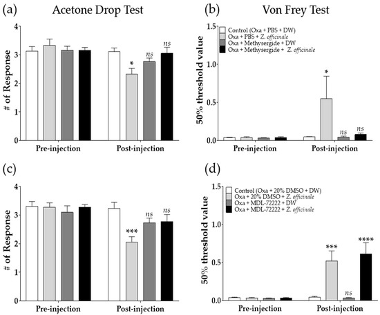 Effect of intrathecal administration of serotonin receptor antagonists on the analgesic effect of Z. officinale against oxaliplatin-induced neuropathic pain. The effect of methysergide (a,b) and MDL-72222 (c,d) on Z. officinale-induced inhibition of cold (a,c) and mechanical (b,d) allodynia. When significant allodynic signs were observed in oxaliplatin-treated mice, methysergide or MDL-72222 was injected intrathecally in mice. PBS or 20% DMSO was used as a control for methysergide and MDL-72222, respectively. Z. officinale or DW was administered orally 20 min after the administration of methysergide, MDL-72222, PBS, or 20% DMSO. Pre-injection: before the injection of PBS, methysergide, 20% DMSO, MDL-7222, and Z. officinale. Post-injection: After the injection of PBS, methysergide, 20% DMSO, MDL-7222, and Z. officinale. Cold and mechanical allodynia were assessed by using the acetone drop and von Frey filament tests, respectively. Control (Oxa + PBS + DW): n = 6, Oxa + PBS + Z. officinale: n = 6, Oxa + Methysergide + DW: n = 5, Oxa + Methysergide + Z. officinale: n = 6 (a, b). Control (Oxa + 20% DMSO + DW): n = 6, Oxa + 20% DMSO + Z. officinale: n = 6, Oxa + MDL-72222 + DW: n = 6, Oxa + MDL-72222 + Z. officinale: n = 6 (c, d). ns: non-significant, * p < 0.05, *** p < 0.001, **** p < 0.0001 vs. Control (Oxa + PBS + DW or Oxa + 20% DMSO + DW) with two-way ANOVA followed by Tukey’s post-test for multiple comparisons.