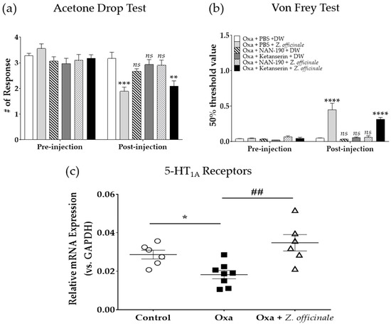 Subsequently, to assess whether the mRNA expression level of spinal 5-HT1A receptor was altered after oxaliplatin and Z. officinale treatment, real-time PCR was conducted to quantify the mRNA expression level of 5-HT1A receptor in the spinal cord. The results showed that the relative mRNA expression level (ratio of 5-HT1A receptor mRNA to GAPDH mRNA) of spinal 5-HT1A receptor was significantly decreased after oxaliplatin treatment (control vs. Oxa, p < 0.05), whereas Z. officinale administration significantly up-regulated the decreased mRNA expression level of 5-HT1A receptor (Oxa vs. Oxa + Z. officinale, p < 0.01), as shown in Figure 4c. This indicated that the expression level of spinal 5-HT1A receptor can be modulated by oral administration of Z. officinale.
