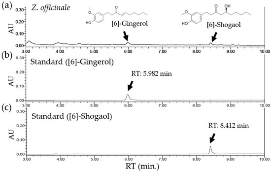 A quantitative analysis of Z. officinale was carried out by the HPLC alliance system, with a 2998 photodiode array detector (Waters, Milford, MA, USA). Separation was done at 30 °C on a C18 column (Waters, Milford, MA, USA; 5 μm, 150 × 4.6 mm2). The sample injection volume was 10 μL. The compounds [6]-gingerol (2 mg/mL) and [6]-shogaol (2 mg/mL) were dissolved in acetonenitrile and used as standards to qualify and quantify components of Z. officinale. At a flow rate of 1.1 mL/min, mobile phase A (water) and mobile phase B (acetonenitrile) were operated using a gradient program (0–1.5 min, hold 35% B; 1.5–1.8 min, from 35 to 60% B; 1.8–5 min, hold 60% B; 5–6.5 min, from 60 to 100% B; 6.5–9 min, hold 100% B; 9–9.1 min, 100–35% B; 9.1–12 min, hold 35% B). The standard ultraviolet detector wavelength was set at 230 nm [50].
