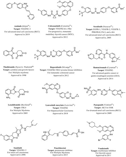 FDA-approved angiogenesis inhibitors for treatment of cancer [18,19]. VEGFR, vascular endothelial growth factor receptor.