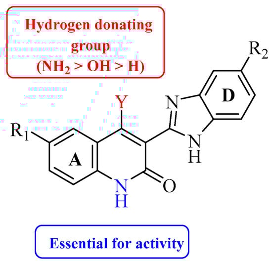 Renhowe et al. synthesized a series of quinolin-2-one analogues that showed promising VEGFR-2 inhibition activity (Table 1) [41]. Upon examining the series of analogues synthesized by Renhowe et al., it was found that the free NH of the hydroquinolin-2-one scaffold (Figure 2), the quinolinone carbonyl, and the benzimidazole NH formed donor–acceptor motifs that would bind to the hinge region of the VEGFR-2, which could be implicated in tumor vasculature formation and maintenance [42,43]. The importance of a hydrogen donating group was found through substituting different groups at the C4 position, observing the potency increasing with (NH2 > OH > H). The incorporation of large basic amine at the C4 position such as an amino quinuclidine resulted in much more potent activity; however, it negatively affected the pharmacokinetics. Therefore, the NH2 substitution at C4 was maintained and subsequent efforts focused on modifying the substitution on both rings A and D to attain additional enzymatic affinity and to improve physicochemical properties.
